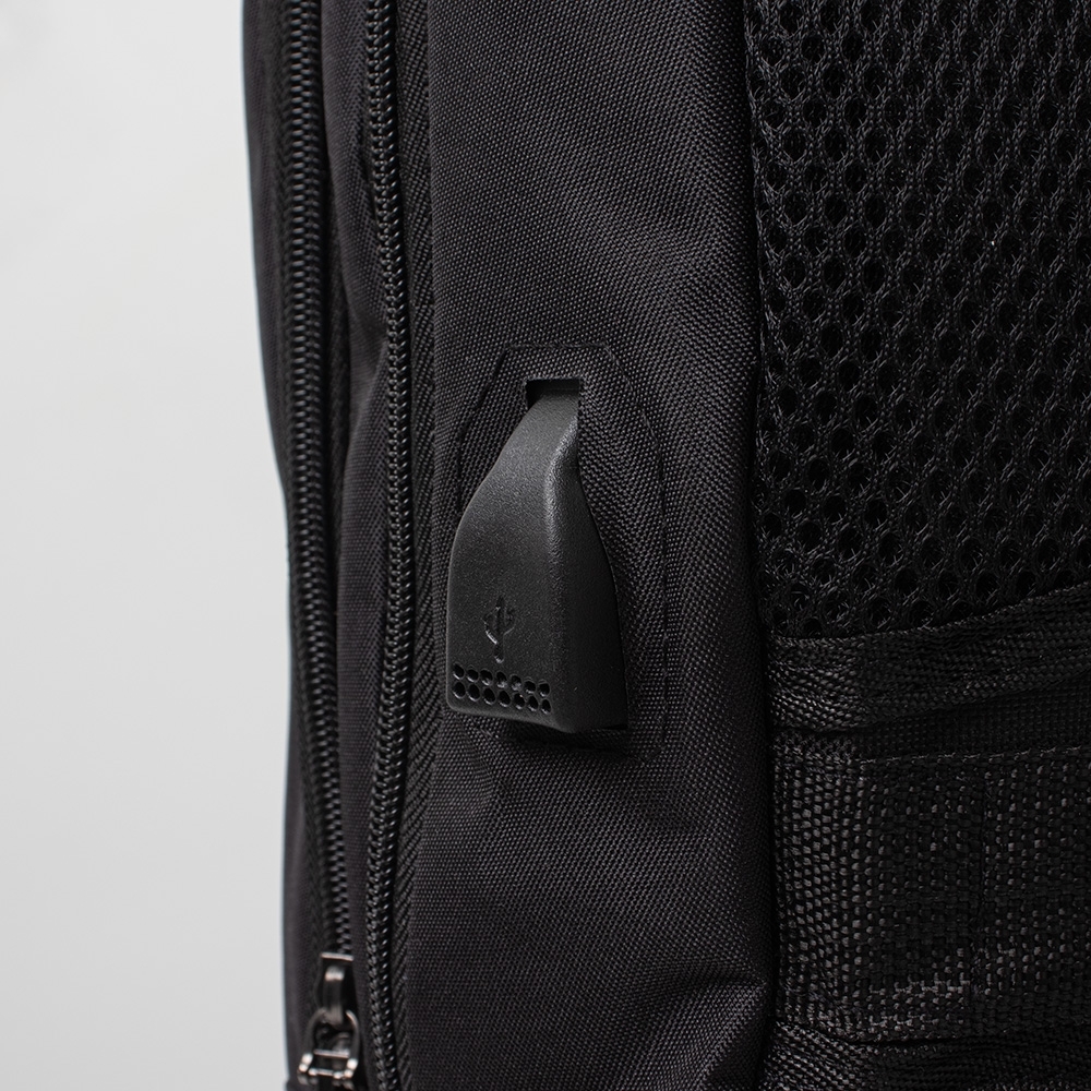 Mochila anti-furto com cadeado de segredo. Produzido em poliéster, tem a parte frontal à prova d’água (respingos). Compartimento principal com bolso para notebook 15,6 e divisórias, bolso de tela, parte externa com cadeado de segredo para trava dos zíperes; e bolso frontal. Possui entrada para fone de ouvido, suporte com entrada USB na parte externa e cabo USB acoplado internamente; permitindo a conexão de um carregador portátil na área interna e a conexão de um eletrônico na área externa, viabilizando a carga e utilização do eletrônico enquanto caminha.