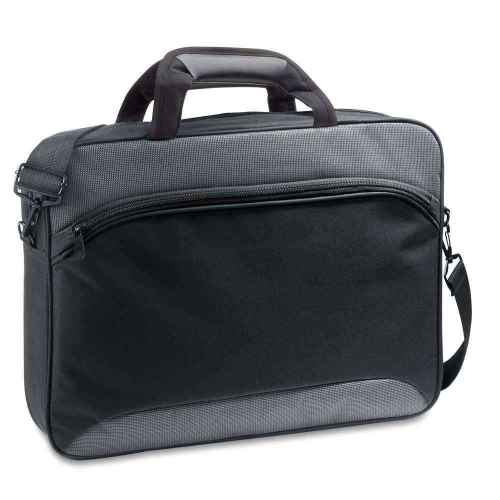 Pasta para notebook. 600D2Tone e 300D. Compartimento forrado, com divisória almofadada para notebook até 15.6''. Bolso frontal com diversos bolsos interiores. Banda para transporte em trolley. Alça de ombro ajustável, com reforço almofadado. 400 x 295 x 75 mm.